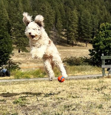 Angel is one of our standout F1 Miniature Aussiedoodle moms—and she definitely lives up to her name. Known around the farm as the “superstar of the pack,” Angel is an absolute powerhouse when it comes to playtime. She can outrun even the full-sized Australian Shepherds and shines brightest during high-energy games like “dog ball.”